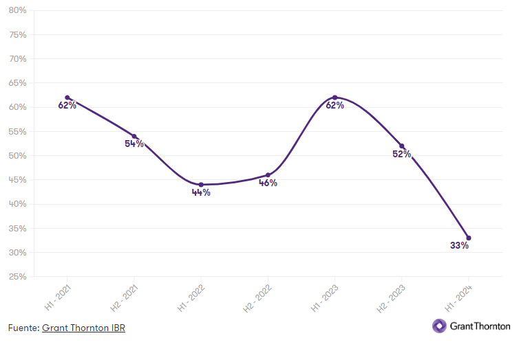 Si observamos las intenciones del sector energético de aumentar los precios de venta, vemos una caída bastante grande. Solo el 33% de las empresas de energía esperan aumentar los precios de venta, en comparación con el 52% en el segundo semestre de 2023 y el 62% en el primer semestre de 2023, lo que en gran parte se refleja claramente en la estabilización de los precios mundiales de la energía.